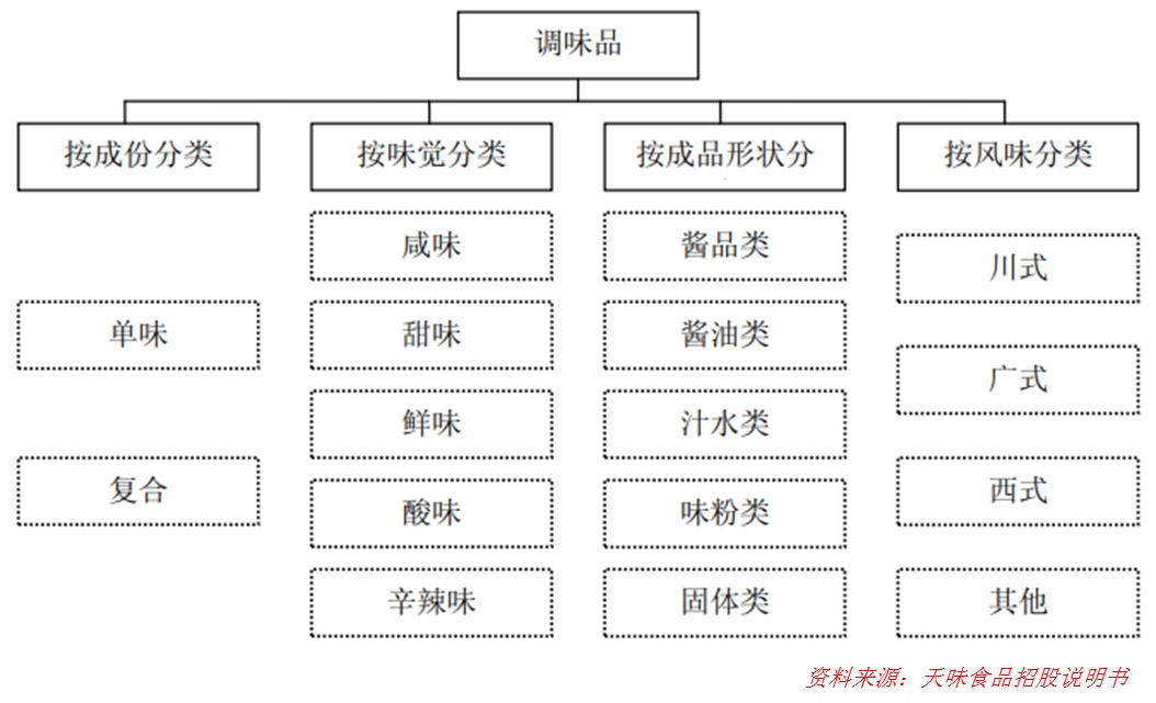 按照产品成分,调味料分为单味调味品(基础调味品)和复合调味品。其中,单味调味品以味精、酱油、醋、腐乳、香辛料、料酒等为代表,原材料构成单一;相比之下,复合调味品则由两种及以上主要成分构成,鸡精、复合调味酱、酱腌菜、火锅调料、中式复合调味品、西式复合调味品等均是典型代表。国际上看,单味调味品与复合调味品的销售额结构约为2:8,以复合调味品为主;国内市场则与之相反,单味调味品仍为主流,复合调味品仍有很大空间。