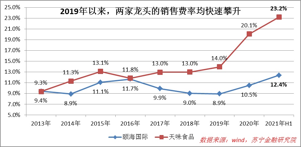 2021年上半年前,颐海国际开始在中式复合调味和方便食品领域启用“筷手小厨”品牌,并加大宣传投入。受此影响,销售费率快速提升,毛利率和净利率均有明显下滑。
